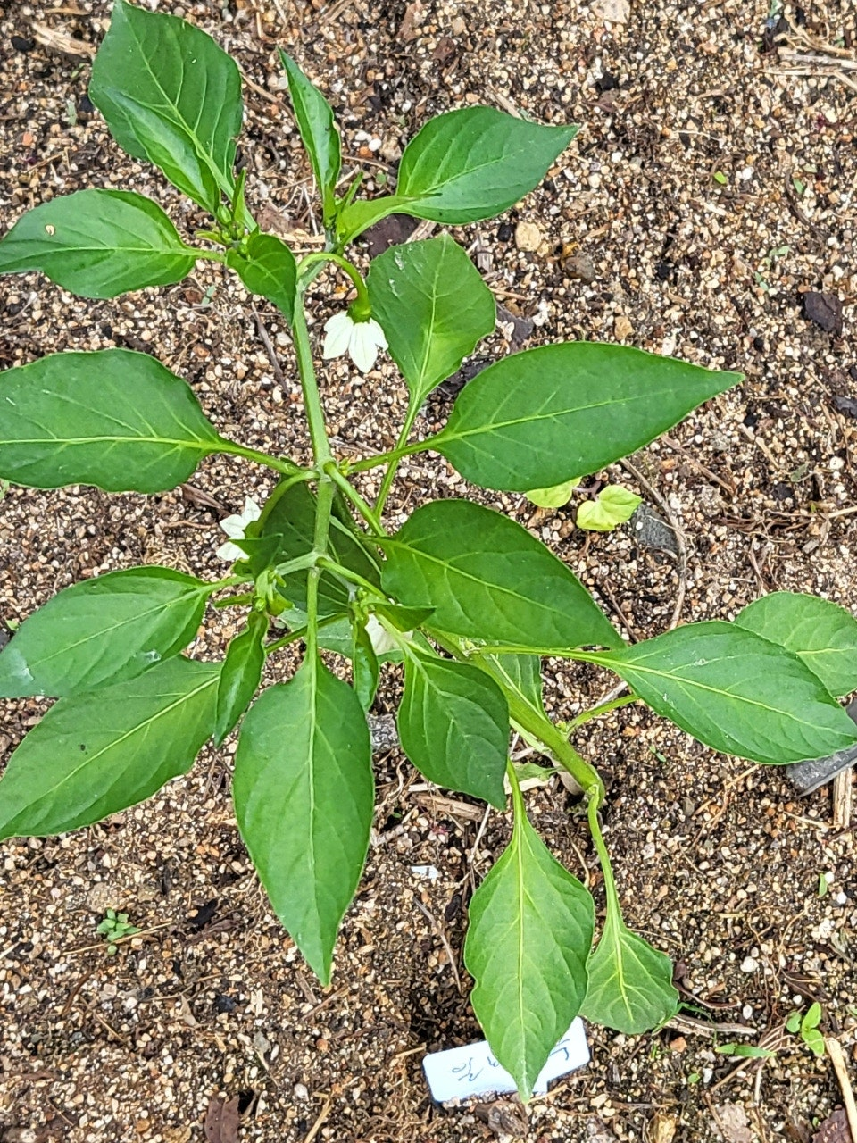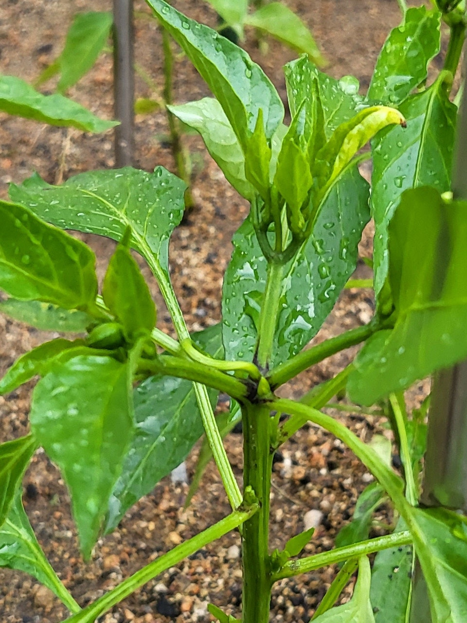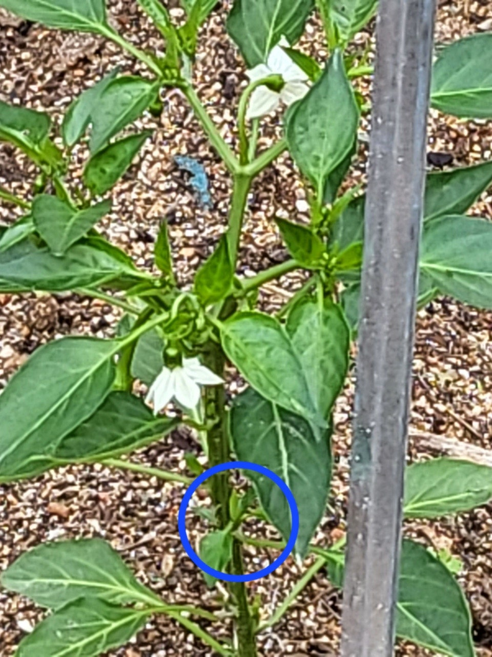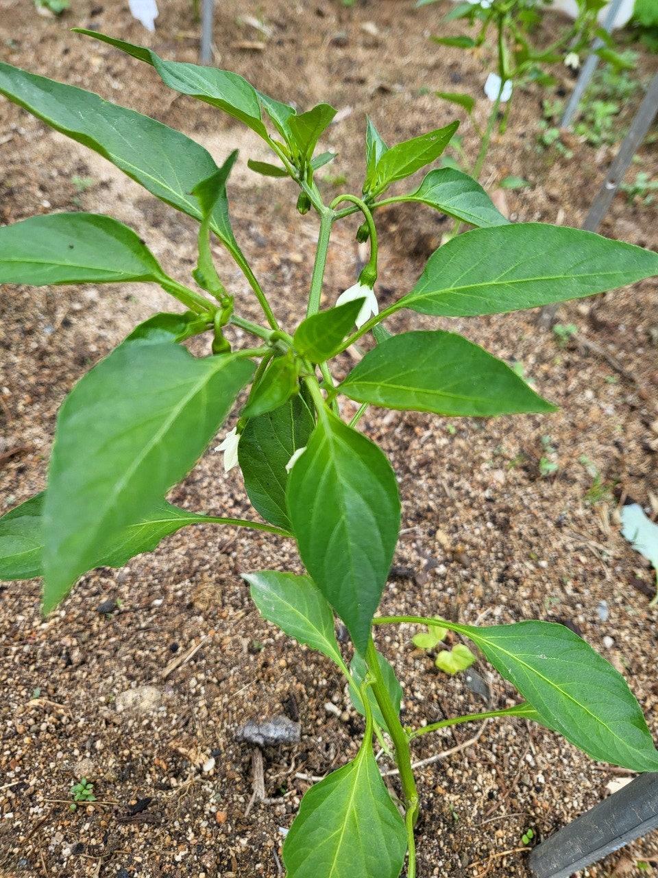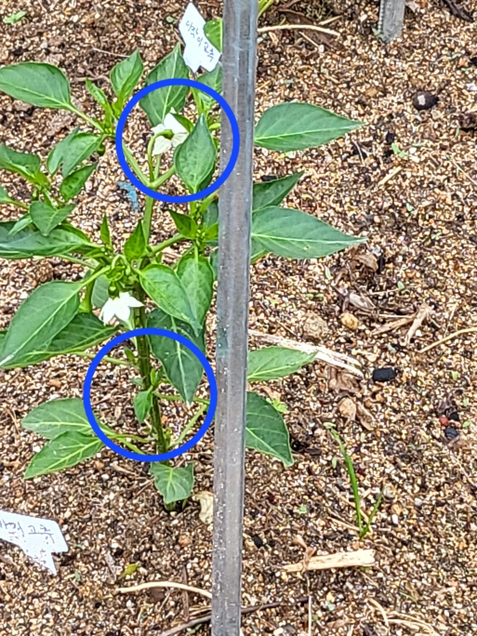 고추의 첫 꽃은 일반적으로 ‘방아다리’라 불리는 분지 지점에서 발생합니다. 이 지점은 줄기가 두 갈래로 갈라지며 본격적인 열매가 달리기 시작하는 구간입니다.