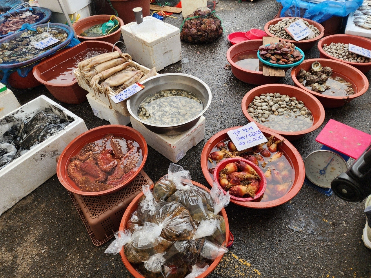 한강과 황해를 끼고 있는 김포 지역답게, 장터에는 싱싱한 생선과 해산물도 많습니다. 시장에서는 조기, 갈치, 고등어, 낙지, 오징어, 바지락 등의 신선한 해산물을 저렴한 가격에 구입할 수 있으며, 특히 직접 손질한 생선을 구입하면 마트보다 훨씬 싼 가격에 신선한 재료를 손에 넣을 수 있습니다.