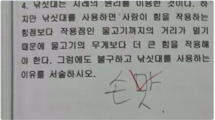 화제가 된 문제에서는 “그럼에도 불구하고 낚싯대를 사용하는 이유를 서술하시오”라는 질문에 대해 ‘손맛’이라는 답이 작성되었고, 이는 오답 처리되었습니다. 형식적으로 보면 서술형 문제에 유머처럼 보이는 단어 하나만 적은 답은 채점 기준에 부합하지 않을 수 있습니다. 그러나 개념적으로 접근하면 이 답변이 완전히 틀렸다고 단정하기도 어렵습니다.