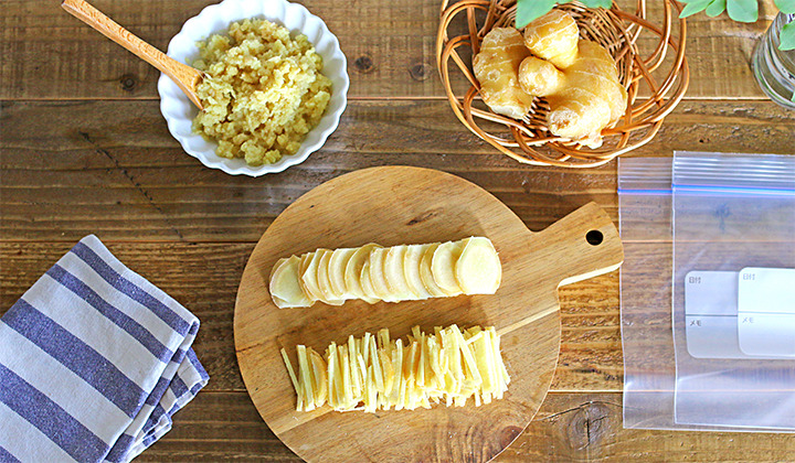 - 생강 껍질을 벗기고 깨끗이 씻은 뒤 물기를 완전히 제거합니다.